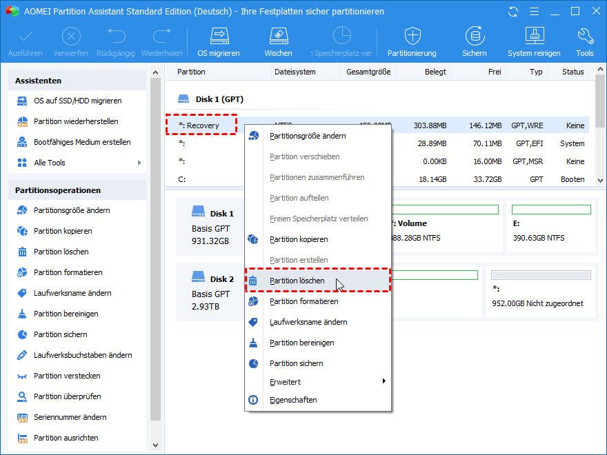 Sie können keine Wiederherstellungspartition mittels Windows 10-Datenträgerverwaltung löschen, da sie über wichtige Dateien verfügt, Sie können jedoch die Wiederherstellungspartition mit diskpart.exe löschen. Sie können die verbleibende Partition mit dem neu erstellten nicht zugewiesenen Speicherplatz jedoch immer noch nicht erweitern, wenn die Wiederherstellungspartition vor dem Laufwerk C: angezeigt wird. Daher benötigen Sie Partitionssoftware von Drittanbietern, um diese Aufgabe zu erledigen. AOMEI Partition Assistant Standard, eine kostenlose Partitionssoftware, kann die Wiederherstellungspartition löschen und eine Partition erweitern, solange ein nicht zugeordneter Speicherplatz auf der Festplatte vorhanden ist.