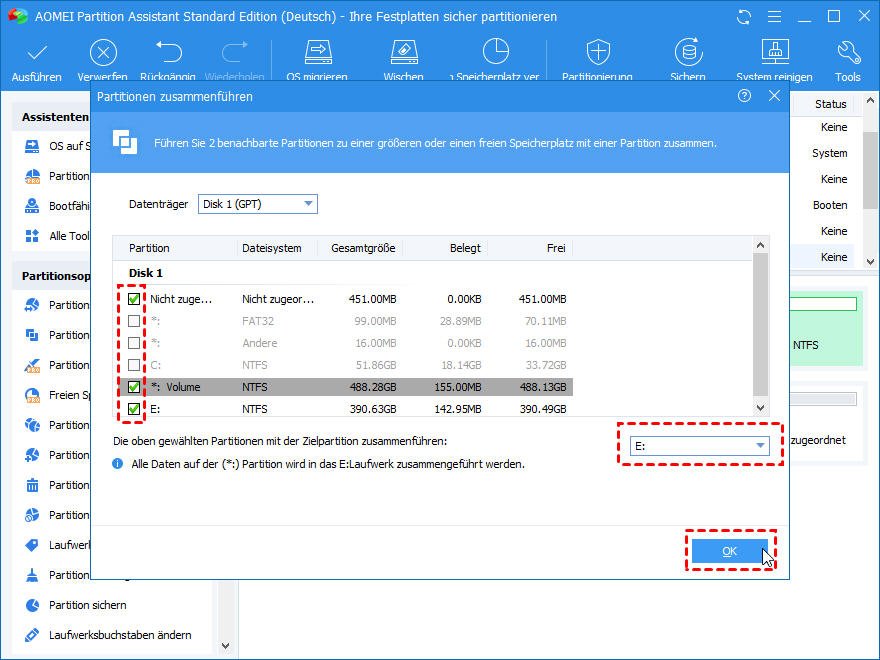 3. Klicken Sie auf „Partitionen zusammenführen". Überprüfen Sie im Pop-out-Fenster den nicht zugeordneten Speicherplatz und die Partition, die Sie erweitern möchten.