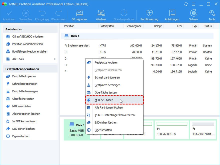 Schritt 3. Sobald Sie sich angemeldet haben, gelangen Sie auf die Hauptoberfläche von AOMEI Partition Assistant. Klicken Sie mit der rechten Maustaste auf das Systemlaufwerk und wählen Sie „MBR neu bilden“.