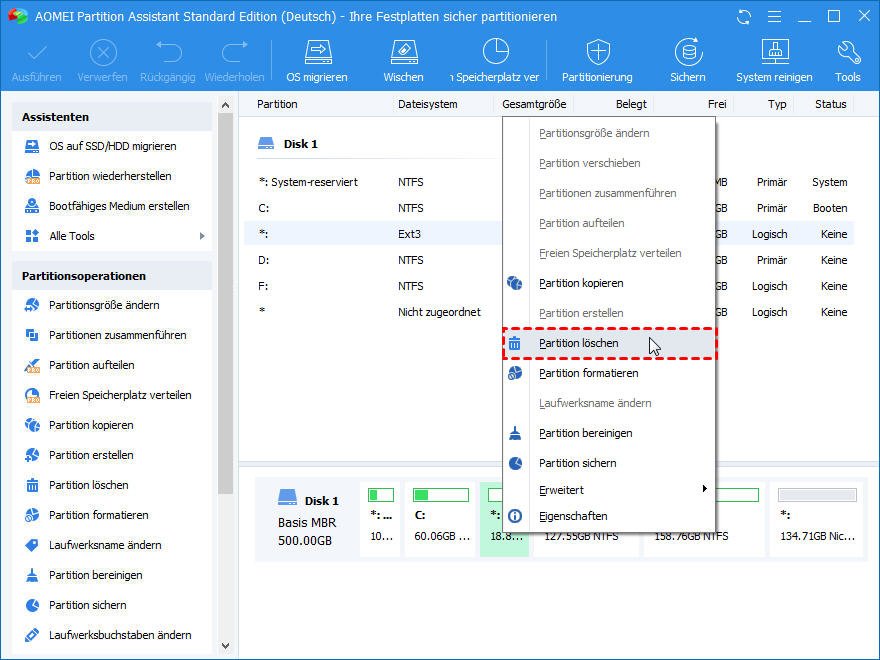 Diese Methode besteht darin, die Partition zu löschen, auf der sich das Betriebssystem befindet, das Sie direkt verwerfen möchten. Wenn Sie Ubuntu und Windows dual booten und nun Ubuntu löschen wollen, empfiehlt sich die Verwendung der Freeware: AOMEI Partition Assistant Standard.