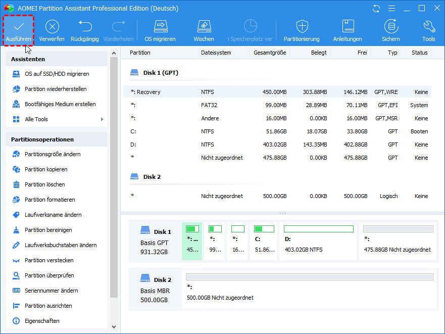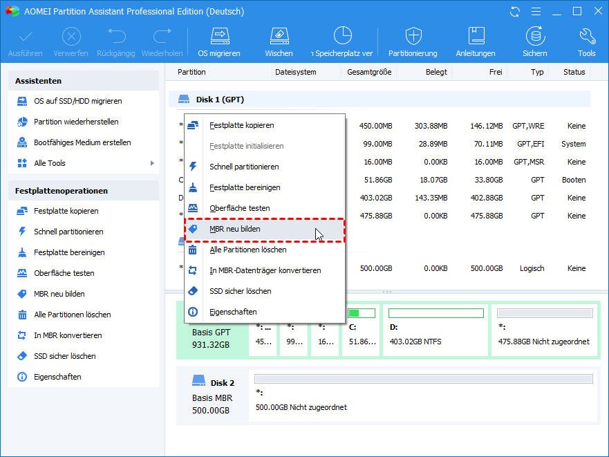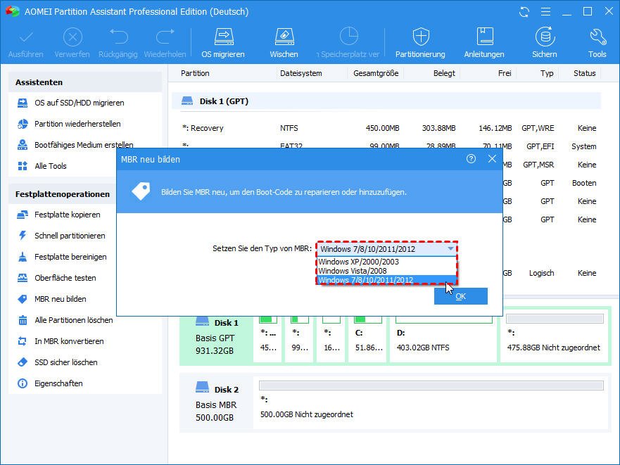 Lösung 2: MBR neu erstellen mit AOMEI Partition Assistant Pro