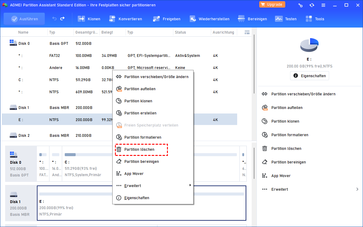 Manchmal Sie wollen die Partition löschen, um Speicherplatz freizugeben. Um die EXT4 Partition zu löschen, können Sie die Funktion „Partition löschen“ verwenden.