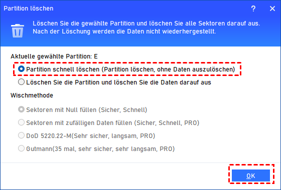 Schritt 2. Ein Fenster wird geöffnet, in dem Sie auswählen können, wie die ausgewählte Partition für „Partition schnell löschen“ (kostenlos) oder „Löschen Sie die Partition und löschen Sie die Daten darauf aus“ gelöscht werden soll. Klicken Sie dann auf OK.