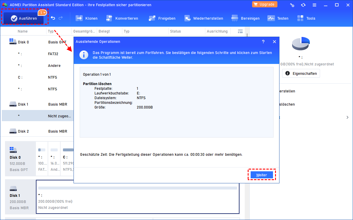 Schritt 5. Jetzt kehren Sie zur Hauptschnittstelle des AOMEI Partition Assistant zurück. Klicken Sie auf Ausführen und anschließend auf Weiter, um die Aufgabe zu bestätigen.