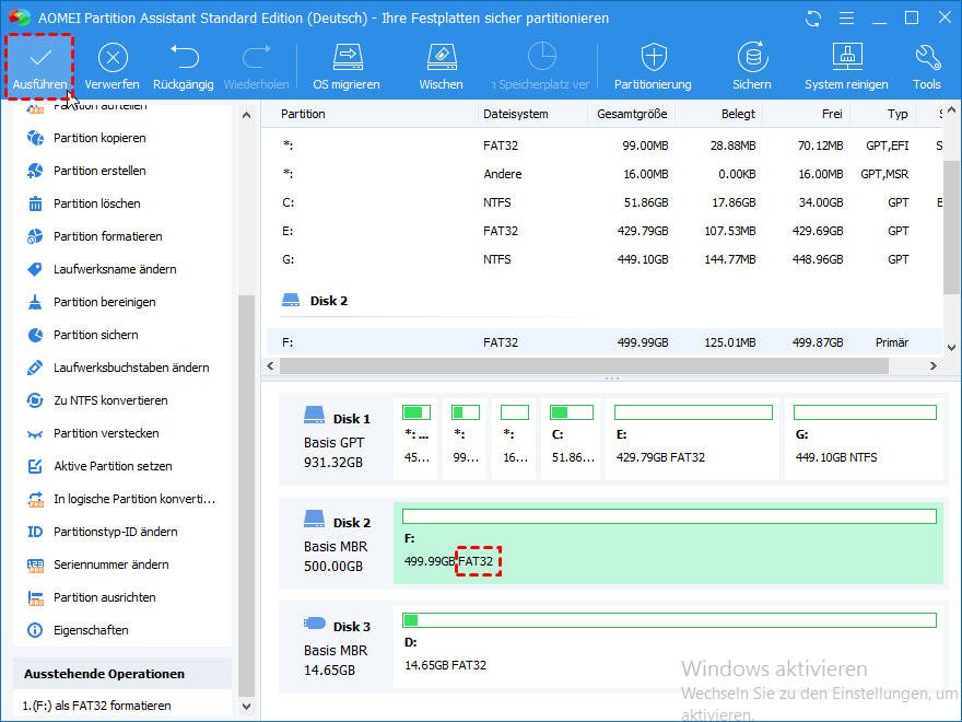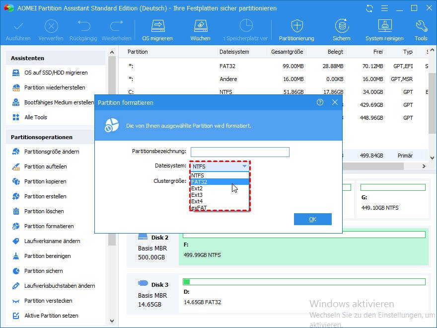 Mit den in Windows 10 integrierten Tools können Sie eine Festplatte, die größer als 32 GB ist, nicht in FAT32 formatieren. Wenn Sie also eine externe Festplatte mit mehr als 32 GB formatieren müssen, z. B. eine externe Festplatte mit 64 GB oder 500 GB, empfiehlt sich eine leistungsstarke Partitionsverwaltungssoftware wie AOMEI Partition Assistant.