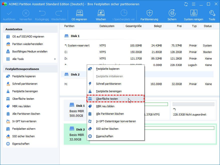 1. Öffnen Sie AOMEI Partition Assistant. Rechtsklicken Sie auf die Festplatte, die Sie scannen wollen, und wählen Sie Testen ⇨ Oberfläche testen. Meist werden fehlerhafte Sektoren der ausgewählten Festplatte überprüft.