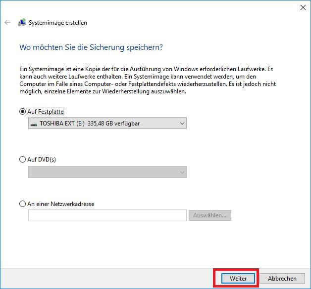 2. Hier können Sie beginnen, ein Systemabbild zu erstellen. Sie werden gefragt, wo Sie das Backup speichern möchten. Wählen Sie den gerade eingesteckten USB-Stick aus und klicken Sie auf Weiter.