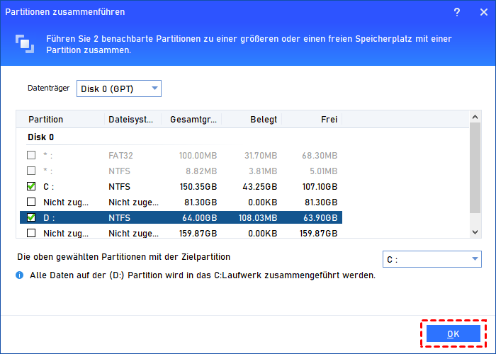 Schritt 2. Hier gelangen Sie zu dem Fenster, in dem Sie die Partitionen auswählen können, die Sie zusammenführen möchten. Aktivieren Sie einfach das Kontrollkästchen vor Disk C und D, wie das folgende Bild zeigt, und klicken Sie auf „OK“.