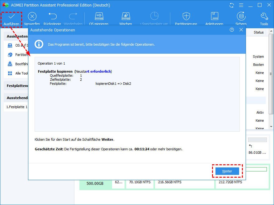 - Weil der Kopiervorgang die Systemfestplatte betrifft, ist ein Neustart erforderlich.