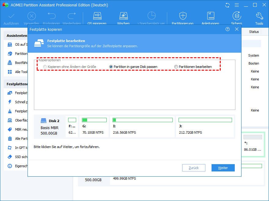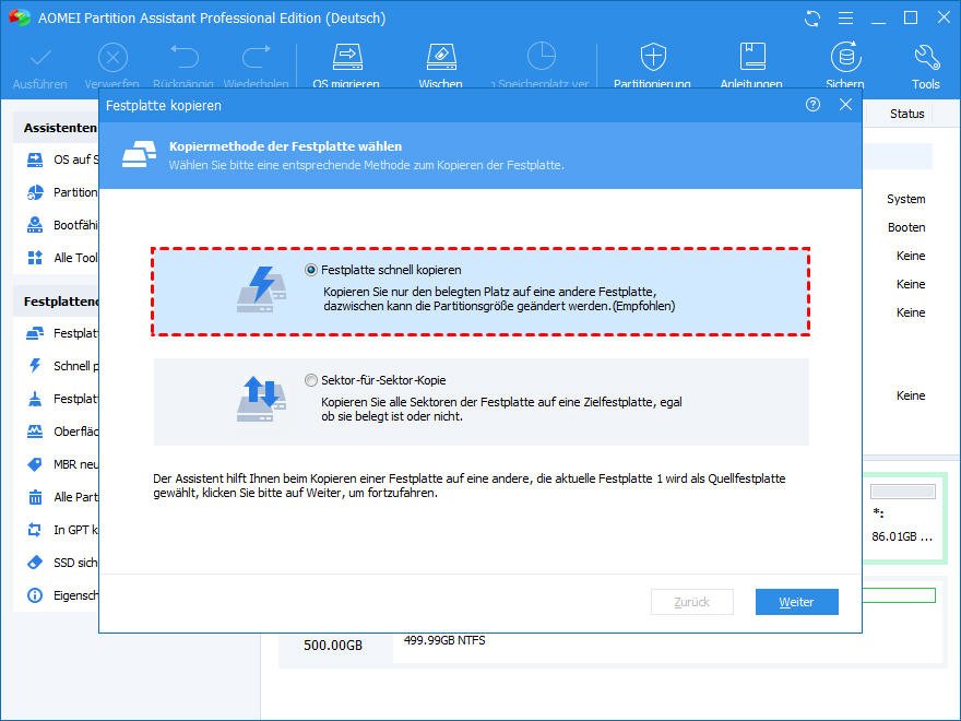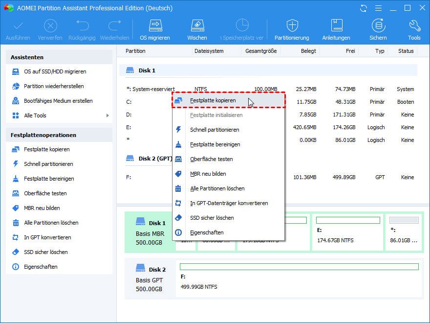 Um MBR unter Windows 11/10/8/7/XP/Vista von einer Festplatte auf andere Festplatte zu kopieren, können Sie AOMEI Partition Assistant Professional verwenden. Mit ihrer Funktion „Festplatte klonen“ können Sie eine gesamte Festplatte (alle Partitionen einschließlich des MBR-Startlaufwerks) auf eine andere Festplatte klonen. Mit der „Partition klonen“ können Sie nur das MBR-Startlaufwerk auf neue Festplatte klonen.