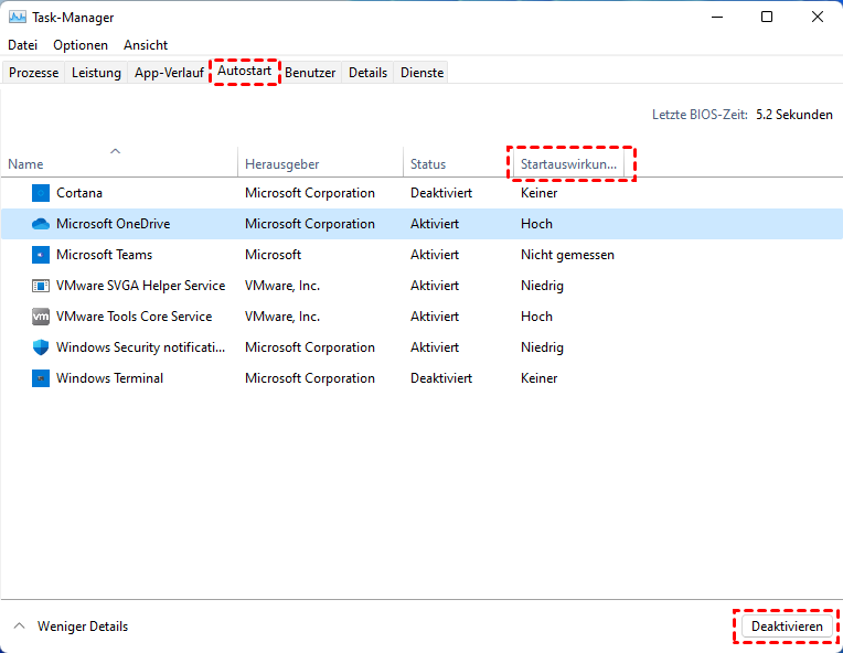 Schritt 2. Sie können auch den Wert „Startauswirkung“ für jede Autostart-Programme überprüfen; „Hoch“ bedeutet, dass die Programme Ihr System erheblich verlangsamen.