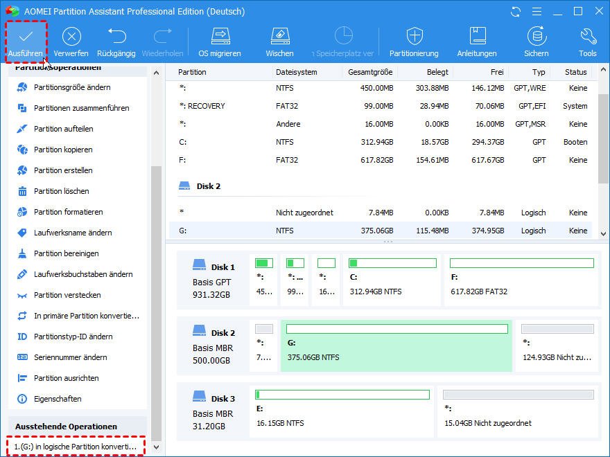 AOMEI Partition Assistant Professional ist eine Software vom Drittanbieter, die der Partitionsverwaltung gewidmet wird. Damit können Sie primäre Partition auf logische in Windows 10 leicht konvertieren. Neben dieser Funktion können Sie auch freien Speicherplatz verteilen, Betriebssystem auf SSD migrieren, die Konvertierung zwischen MBR und GPT machen.
