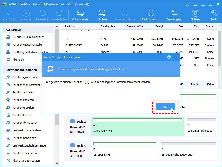 Wie kann man Windows 10 primäre Partition in logische konvertieren?