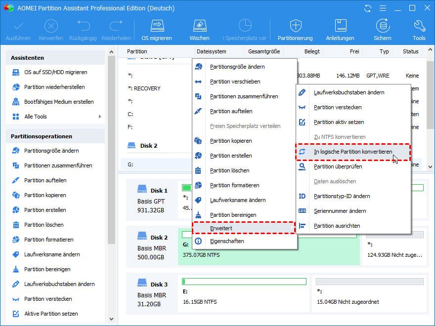 • Konvertieren einer primären Partition in logische Partition wird vor allem auf Basis-MBR-Datenträgern verwendet.
