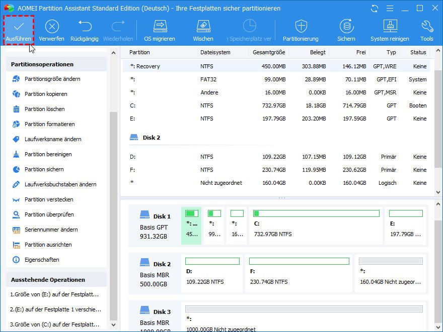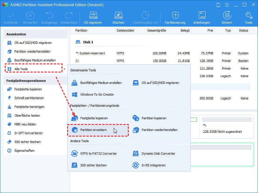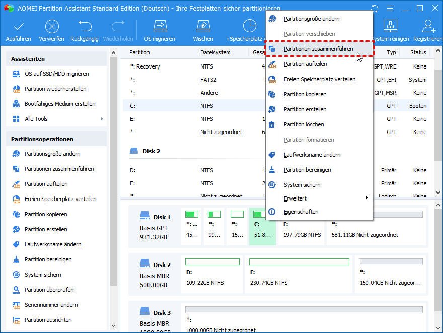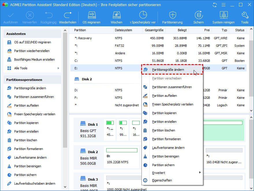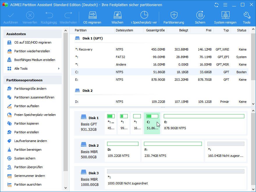 Wegen der Einschränkung der Datenträgerverwaltung empfehle ich Ihnen eine Drittanbieter-Software, die wegen ihrer umfassenden Funktionen von Anwendern anerkannt werden. Mit Rücksicht auf die Funktionen und den Preis empfehlen wir Ihnen hier AOMEI Partition Assistant Standard, das fast alle Probleme über Ihre Partitionen lösen kann und kostenlos ist.