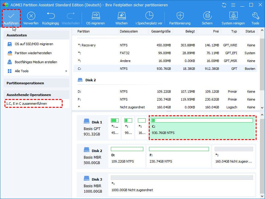 Schritt 3. Auf dem Hauptbildschirm werden Sie sehen, dass das Laufwerk C und das Laufwerk D bereits zusammengeführt worden sind. Klicken Sie auf der linken oberen Seite auf „Ausführen“, um alle Vorgänge abzusenden.