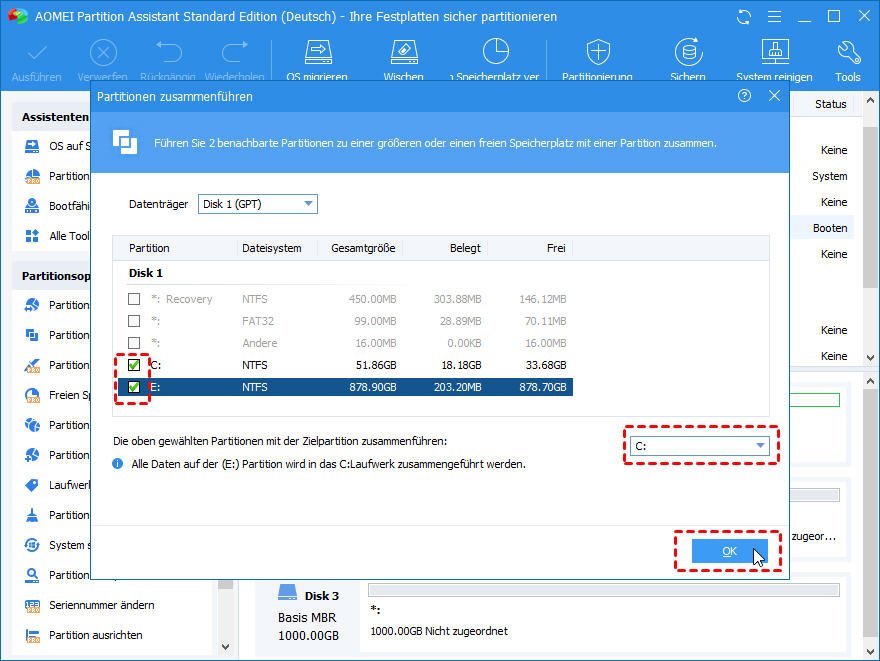 1. Durch Zusammenführen von Partitionen die primäre Partition erweitern