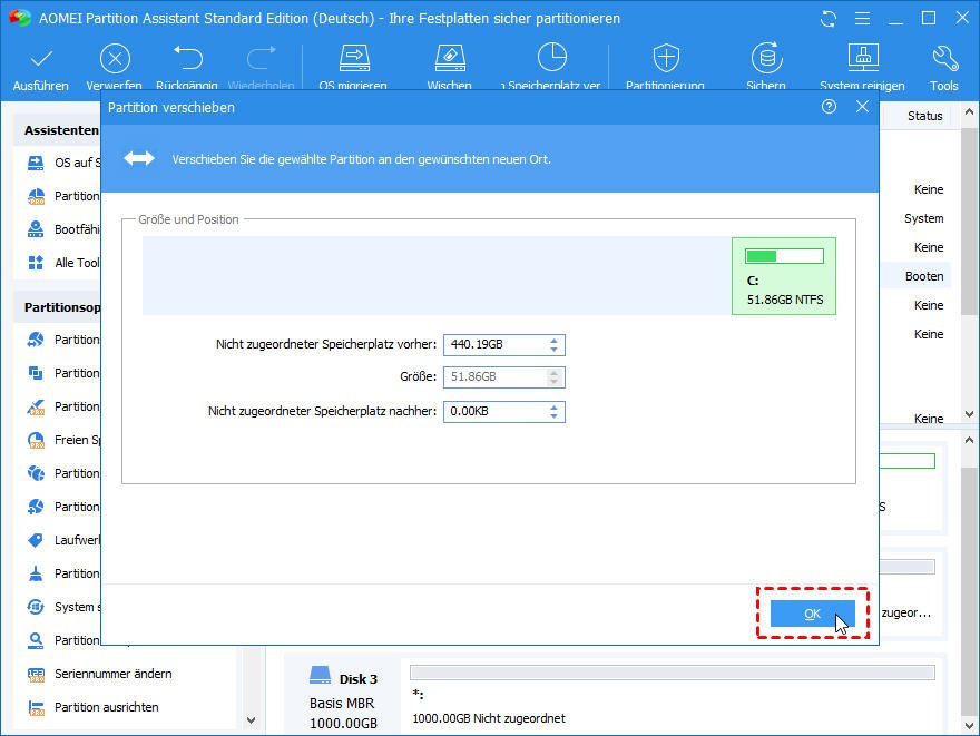 Partition verschieben, um den Speicherplatz zu erweitern