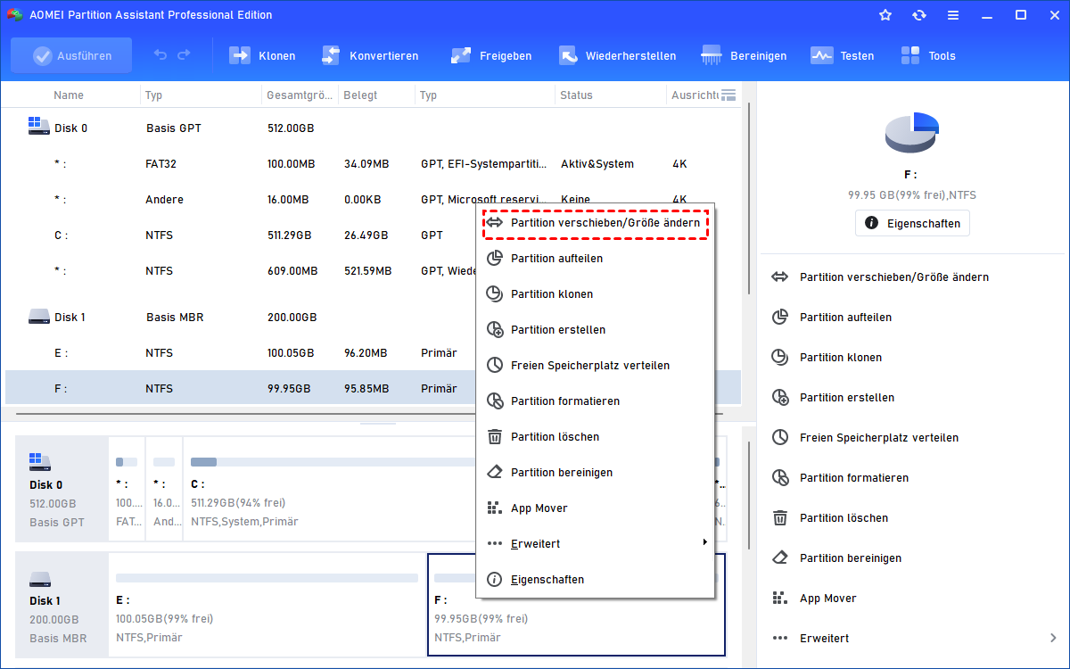 Schritt 1. Installieren Sie AOMEI Partition Assistant und führen Sie es aus. Klicken Sie mit der rechten Maustaste auf die Zielpartition und wählen Sie Partition verschieben/Größe ändern.