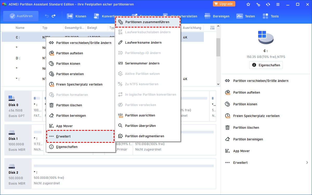 Aber keine Sorge, mit der Funktion „Partitionen zusammenführen“ von AOMEI Partiiton Assistant Standard können Sie den nicht angrenzenden nicht zugeordneten Speicherplatz in drei Schritten zu einer anderen Partition hinzufügen: