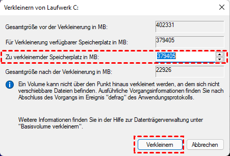Hinweis: Sie können die Partition auch von vorne verkleinern, indem Sie den Schieberegler nicht nur vom Ende nach rechts ziehen.