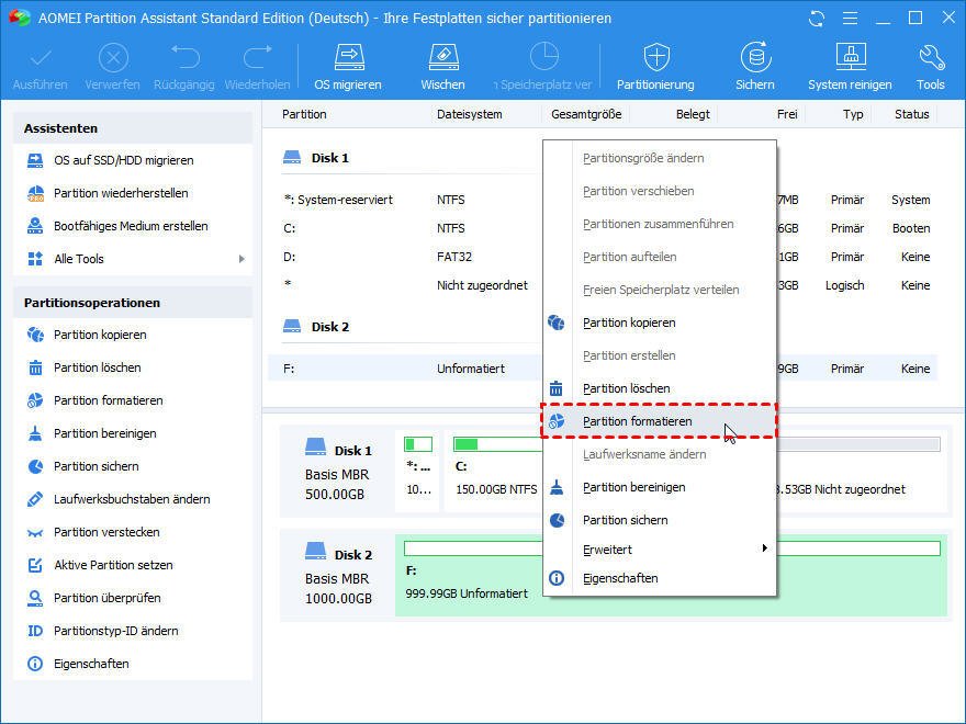 Daher wird empfohlen, das leistungsstarke Festplatte Formatieren Tool AOMEI Partition Assistant zu nutzen, das die Beschränkung der Partitionsgröße von 32 GB bricht und Ihnen mehr Optionen über das Dateisystem bietet. Die Software hat auch viele Funktionen wie das Erstellen von Partitionen, das Löschen von Partitionen, das Ändern von Partitionsgrößen, PC Cleaner, usw.