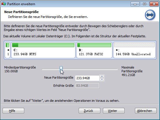 Schritt 4. Schieben Sie den Regler nach rechts, um den freien Speicherplatz an Systempartition zuzuweisen und dann klicken Sie auf „Weiter“.