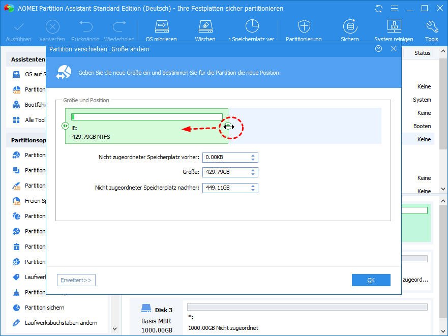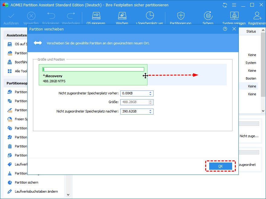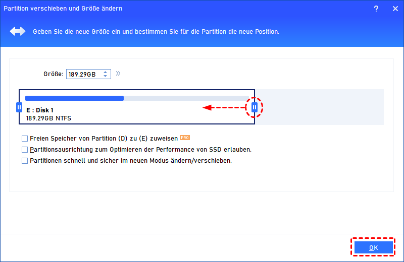 4. Ziehen Sie im Pop-up-Fenster das Wiederherstellungslaufwerk, um den freien Speicherplatz auf der rechten Seite freizugeben, oder geben Sie die bestimmte Größe ein, und klicken Sie dann auf OK.