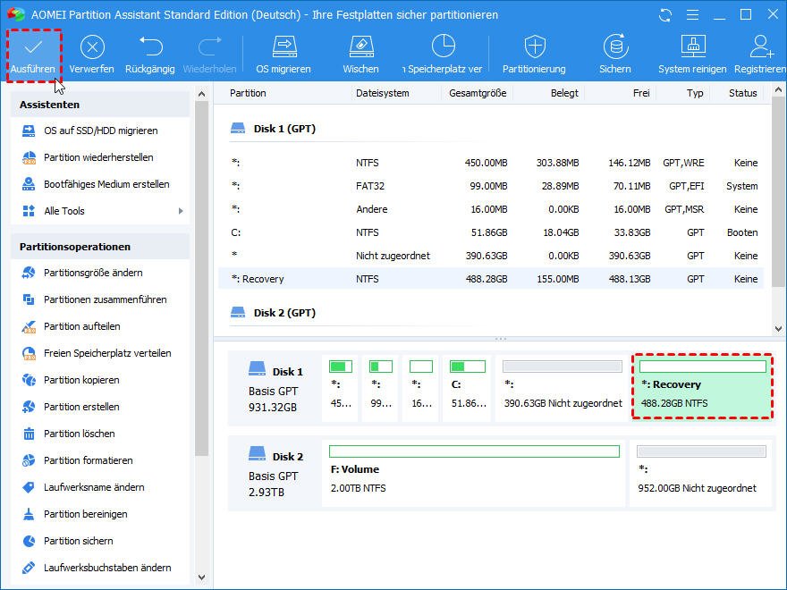 3. Jetzt wird die Wiederherstellungspartition schon vergrößert. Klicken Sie auf Ausführen und Weiter, um den Vorgang auszuführen.
