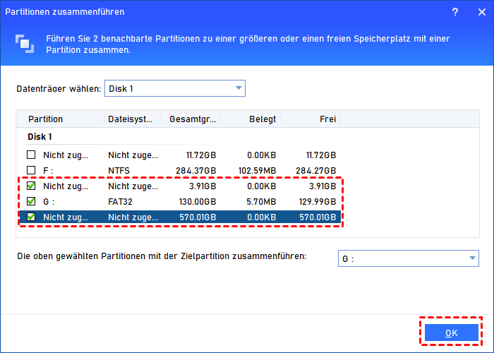 Schritt 2. Wählen Sie hier die Systempartition und den nicht zugewiesenen Speicherplatz aus und klicken Sie auf OK.