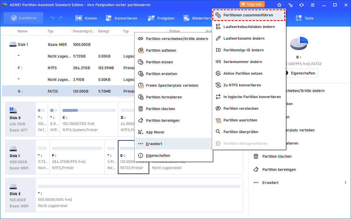 Schritt 1. Installieren und starten Sie AOMEI Partition Assistant Standard. Klicken Sie mit der rechten Maustaste auf die Systempartition und klicken Sie auf Erweitert ⇨ Partitionen zusammenführen.