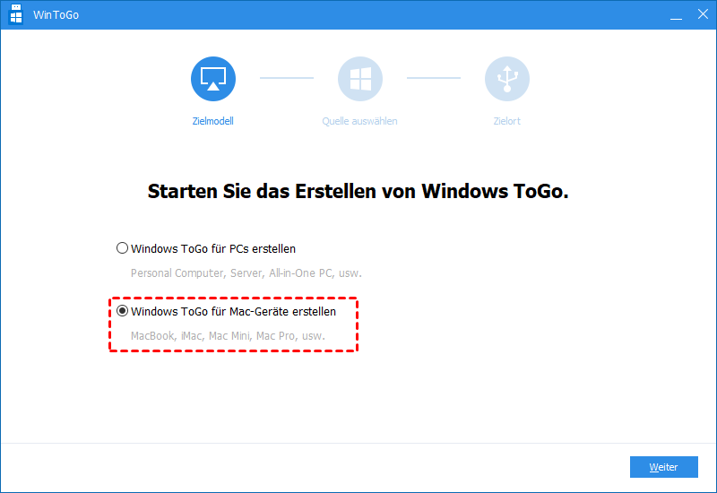 Schritt 2. Wählen Sie im Popup-Fenster „Windows ToGo für Mac-Gräte erstellen“ und klicken Sie auf die Schaltfläche „Weiter“.