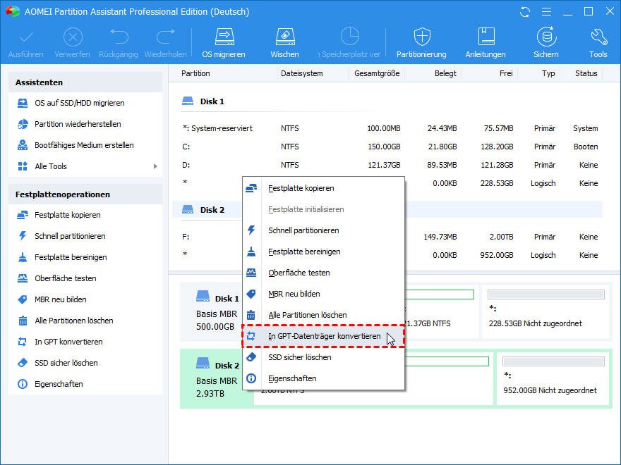 Um das maximale Festplattenlimit in Windows komplett zu beheben, empfehle ich Ihnen leistungsfähiges AOMEI Partition Assistant. Mit ihm können Sie die Festplatte von MBR zu GPT einfach konvertieren. Sie müssen nur die folgenden Schritte befolgen.