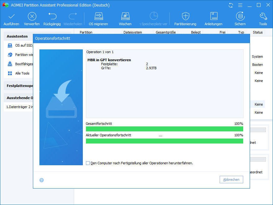 • Wenn Sie eine Festplatte mit dem Betriebssystem von MBR zu GPT konvertieren müssen, aktualisieren Sie bitte auf AOMEI Partition Assistant Professional.