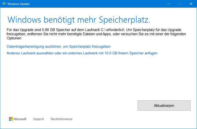 Windows 10 Upgrade hat zu wenig Speicherplatz, wie zu beheben?