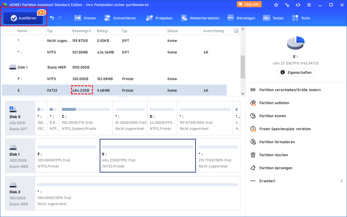 Schritt 1. Laden Sie AOMEI Partition Assistant Standard herunter, installieren Sie es und führen Sie es aus. Klicken Sie auf eine Partition (wie Laufwerk E), die freien Speicherplatz enthält, und wählen Sie im linken Bereich Partition verschieben/Größe ändern.