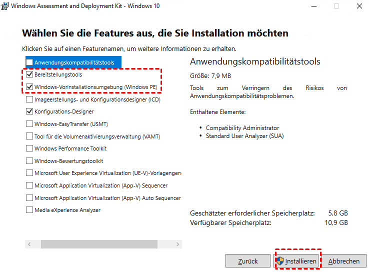 Schritt 4. Aktivieren Sie die Optionen „Bereitstellungstools“ und „Windows-Vorinstallationsumgebung (Windows PE)“ und klicken Sie auf „Installieren“.