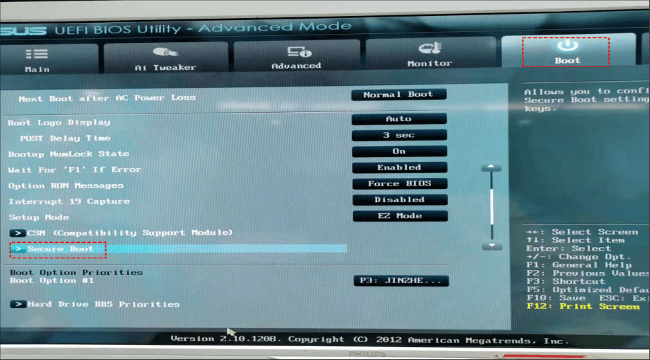 Schritt 1. Starten Sie Ihren Computer neu, drücken Sie die entsprechende Taste, um das BIOS aufzurufen, klicken Sie dann auf „Boot“ und wählen Sie „Secure Boot“.