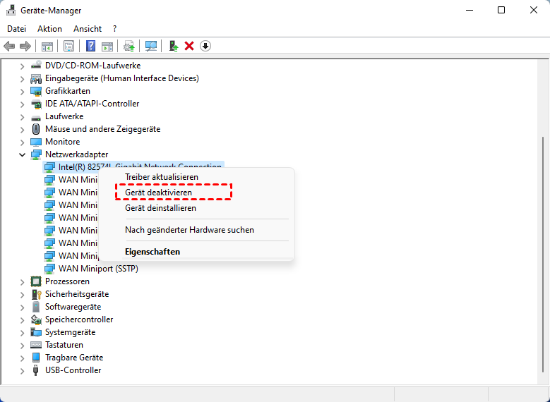 Schritt 2. Klicken Sie mit der rechten Maustaste auf den ersten Netzwerkadapter und wählen Sie „Gerät deaktivieren“.
