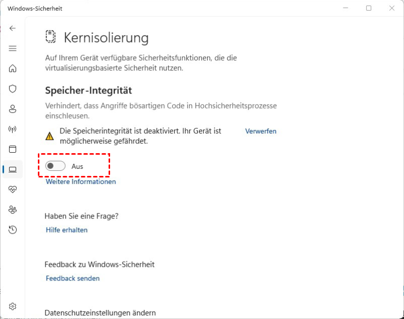 Schritt 3. Schließen Sie die Einstellungen, wenn die Speicher-Integrität deaktiviert ist.