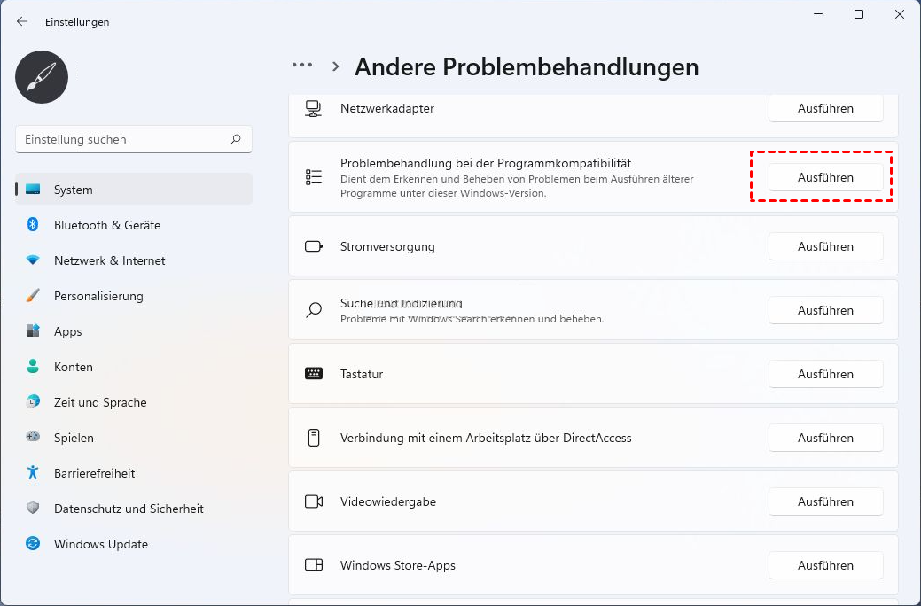 Schritt 3. Suchen Sie Problembehandlung bei der Programmkompatibilität und klicken Sie auf Ausführen.