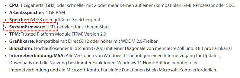 Diese Situation ist für Legacy-Benutzer. Windows 11 erfordert Secure Boot, eine spezielle Funktion von UEFI. Wenn Sie einen MBR-Datenträger verwenden, müssen Sie auf den GPT-Datenträger umstellen, da nur GPT die Systemfestplatte für den UEFI-Boot-Modus sein kann.