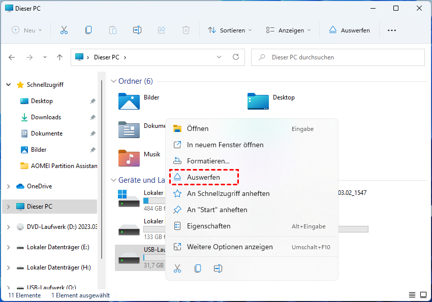 Schritt 2. Suchen Sie das USB-Gerät, das Sie entfernen möchten, klicken Sie mit der rechten Maustaste darauf und wählen Sie „Auswerfen“ aus dem Menü.