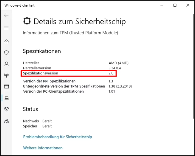 Schritt 2. Windows zeigt nun Informationen zum TPM-Chip an. Überprüfen Sie, ob neben „Spezifikationsversion“ „2.0“ angezeigt wird.