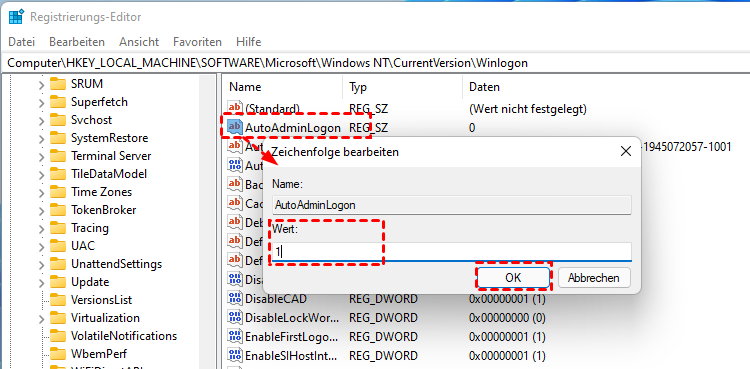 Schritt 9: Doppelklicken Sie auf AutoAdminLogon und ändern Sie den Wert von „0“ auf „1“. Klicken Sie auf OK, um zu bestätigen.
