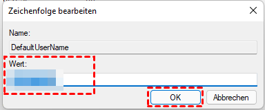Schritt 5: Doppelklicken Sie auf DefaultUserName oder klicken Sie mit der rechten Maustaste darauf und wählen Sie Ändern. Geben Sie den korrekten Benutzernamen oder die E-Mail-Adresse des Zielkontos im Bereich „Wert“ ein. Klicken Sie auf OK, um zu bestätigen.