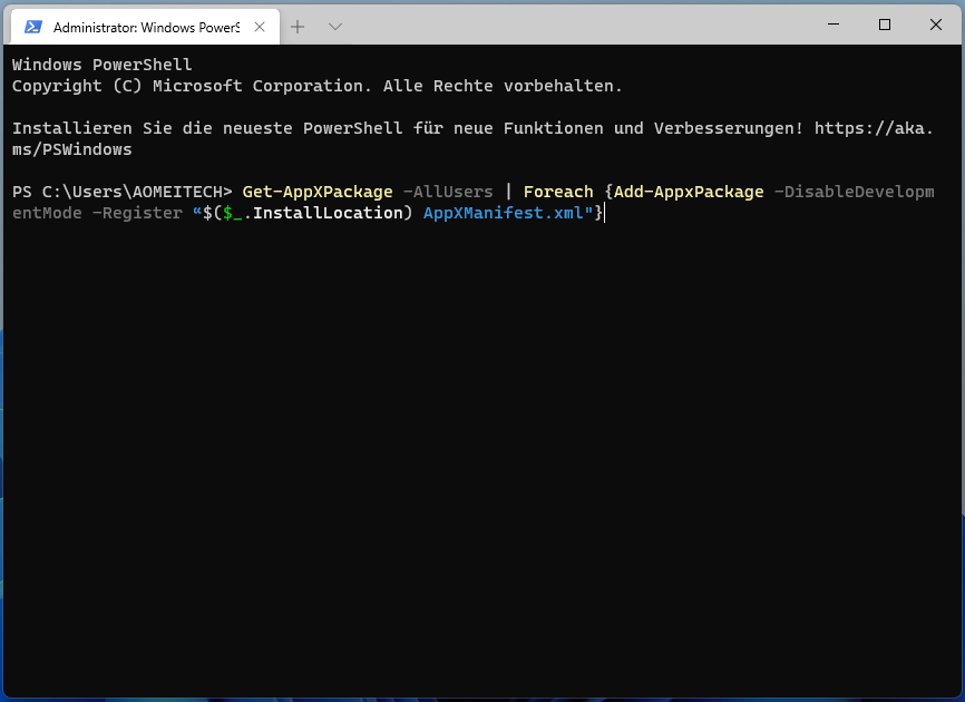 Get-AppXPackage -AllUsers | Foreach {Add-AppxPackage -DisableDevelopmentMode -Register „$($_.InstallLocation) AppXManifest.xml“}
