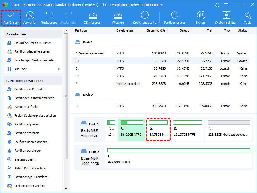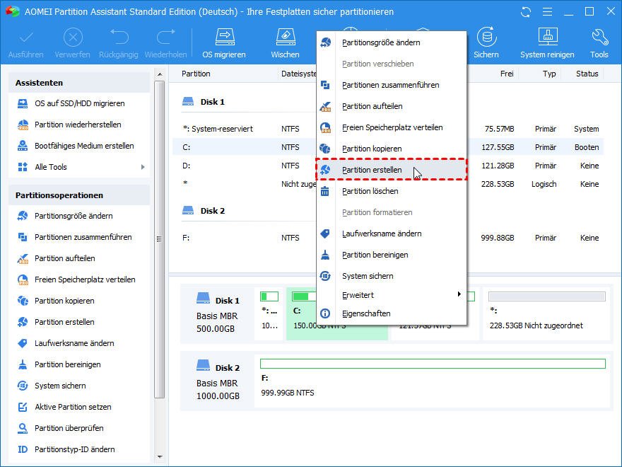 Wie erstellt man eine Partition in Windows 7 von C-Laufwerk? Die Antwort ist, dass Sie nur drei Klicks benötigen. AOMEI Partition Assistant macht es einfacher. Mittlerweile können Sie mit dieser Software viele andere Plattenoperationen durchführen. Zum Beispiel, Partitionen zusammenführen, wenn die MBR-Festplatte bereits vier primäre Partitionen enthält. Migration von OS auf SSD, wenn Sie eine bessere Leistung deines PCs bekommen möchten. Alles in allem ist es nützlich und benutzerfreundlich und leistungsstarke Software, und es lohnt sich zu versuchen.