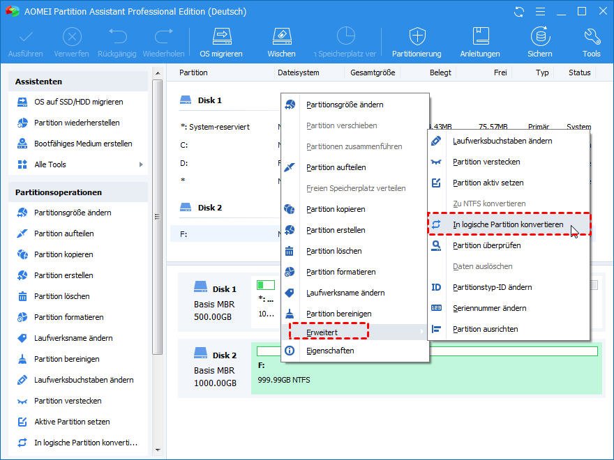 Rechtsklicken Sie auf die primäre Partition, die Sie konvertieren möchten, und wählen Sie dann Erweitert und In logische Partition konvertieren. Klicken Sie auf OK, um die Operationen im folgenden Popup-Fenster zu bestätigen. Übernehmen Sie den Vorgang, indem Sie in der Symbolleiste auf Ausführen klicken.