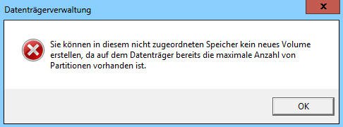 Sobald 3 primäre Partitionen und 1 erweiterte Partition erstellt wurden, erhalten Sie folgende Fehlermeldung beim Erstellen eines neuen Volumes: „Sie können in diesem nicht zugeordneten Speicher kein neues Volume erstellen, da auf dem Datentäger bereits die maximale Anzahl von Partitionen vorhanden ist.“